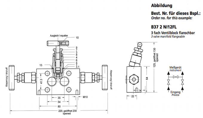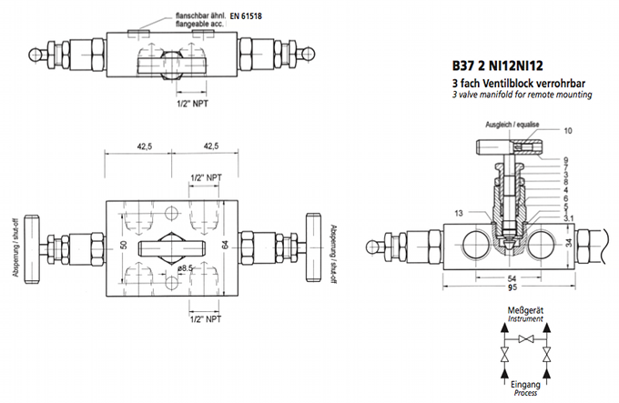 This 3 valve manifold is designed for remote / direct mounting to a transmitter. It has two block valves (+ and - lines) and an equaliser valve. |