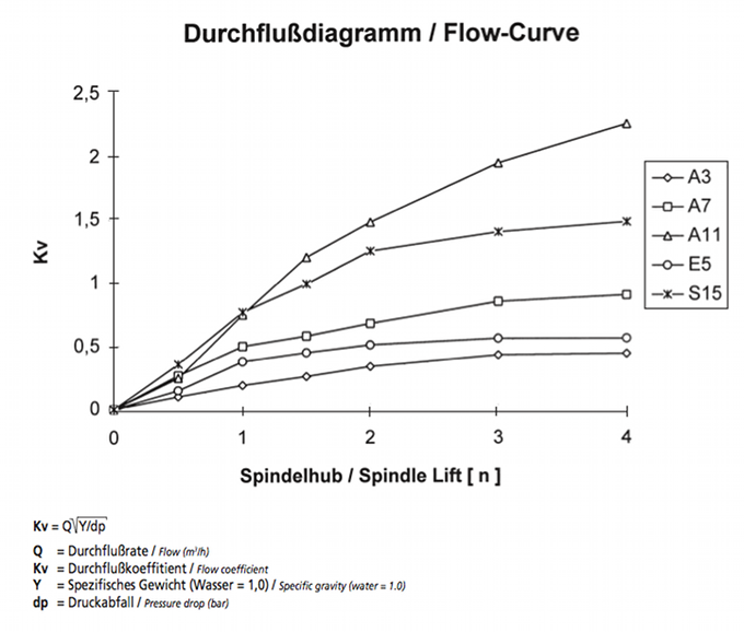 Bollin shut-off valves are mostly used in the opening or closing of liquid-pathways. They comprise a cone metal sealing. Should these valves be intendend to serve to the fine regulation of a flow of volume, then we recommend that you apply a regulating-cone (see at regulating-cone). In the following diagram you will find the flow capacity curves of our valves with standard cones. In these diagrams the flow coefficient Kv (Kv = 0,86xCv) is shown in relation to the spindle lift. The flow coefficient Kv is the flow of a volume of water in m3/h with a pressure drop across the valve of dp = 1 Kp/cm2.