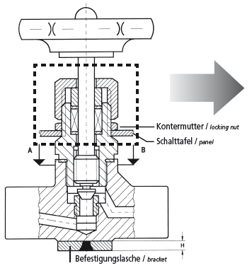 ![]() Valves are available with an extra long external thread on the bonnet to allow panel mounting. |