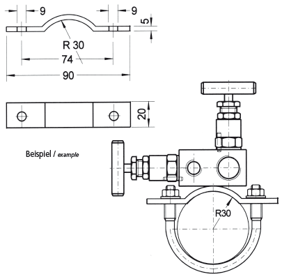 This bracket is welded at a valve or a manifold. Thus mounting is possible at an instrument panel or to a pipe rack with a fixingbolt. (s. also Zubehör für Ventilblöcke) |