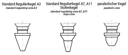Valves with regulating cone offer the possibility for better flow regulation. There are different forms (parabolic form, step-cone, taper-cone (standard)). |